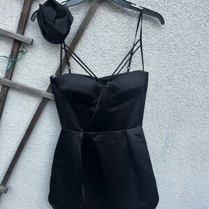 Girly, playful and youthful, that’s the vibe of our fitted corset black bell mini dress with an elegant rose decor on the shoulder. Bones and cups of the corset part delicately hug the body curves, while the bell skirt adds air and playful bounce to the look. The dress is made of medium-density fabric with a delicate sheen. Lined.