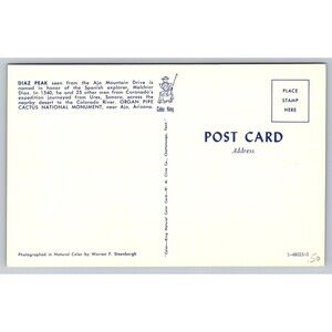 This vintage postcard from the 1960s features Diaz Peak in the Organ Pipe Cactus National Monument near Ajo, Arizona. Published by Cline Co, this original printed postcard captures the landscape and architecture of the monument. Measuring a standard size of 5.5 x 3.5 inches with a divided back and chrome features, this collectible piece is a great addition for topographical postcard enthusiasts and lovers of historical landmarks in the United States. Pre-owned. Unposted. Very nice condition. See photos for condition and wear. Great Bundle Item!