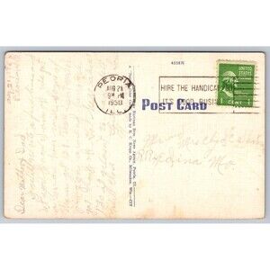 The product is a vintage linen postcard from the 1950s featuring Glen Oak Park Lagoon and Bird Island in Peoria, Illinois. Published by EC Kropp, the postcard measures a standard size of 5.5 x 3.5 inches and is original, not a reprint. The postcard's subject includes Bird Island, boats on the lake, and suggestions of tourism, travel, landscapes, animals, community life, amusement parks, transportation, people, and towns. It is a unique, collectible item that provides a glimpse into the culture and history of Peoria in the mid-20th century. Pre-owned, Used. See photos for condition and wear. Has edge and corner wear. Posted in 1950 with a one cent stamp. Postmark says "Hire The Handicapped It's Good Business". Great Bundle Item!