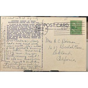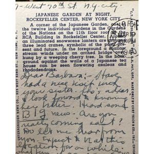 This vintage postcard displays the Japanese Garden at Rockefeller Center, New York City, captured in a serene nighttime scene. Suitable for all, it's made from high-quality paper.