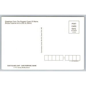 This postcard features the Goat Island Light Lighthouse in Cape Porpoise, Maine, captured in a photochrome style from 1987. With a standard size of 5.5 x 3.5 inches, this single unit postcard is an original print depicting the lighthouse, sailboat, and other elements specific to the region. Made in the United States during the 1980s, this collectible postcard showcases the charm of cities and towns in Maine, making it a unique addition to any postcard collection focusing on Americana and topography. Pre-owned, unposted. See photos for condition and wear. Zip+4 boxes. Good condition. Great Bundle Item!