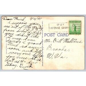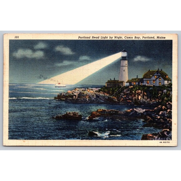 This vintage postcard features a night view of the Portland Head Light Lighthouse in Maine, USA, with a Steamship, from 1941 during World War II. Measuring at a standard size of 5.5 x 3.5 inches, this original linen postcard showcases the iconic lighthouse in the city of Portland. The postcard is stamped, has a divided back, and a white border, making it a unique and collectible piece of topographical postcard history from the era of 1930-1945. Posted from Portland, Maine in 1941 with a one cent defense stamp. It is posted nearly four months before the Bombing of Pearl Harbor. See photos for condition and wear. Casco Bay. Great Bundle Item!