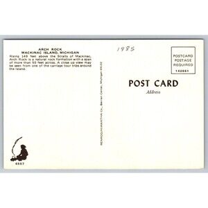 The product is a vintage postcard from 1985 featuring the Arch Rock on Mackinac Island in Michigan. It is an original printed lithograph with a size of 5.5 x 3.5 inches. The postcard was manufactured by Penrod Hiawatha and depicts a scene of tourism, landscapes, famous places, and roadside America. It is a single unit with a divided back and chrome features, showcasing the beauty of North America and specifically the United States. Pre-owned, Used, See photos for condition and wear. Great Bundle Item!