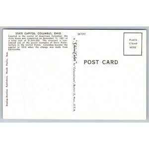 This vintage postcard from the 1950s features the Ohio State Capitol in Columbus, showcasing the Doric architecture in a printed lithograph format. Published by Colourpicture, this original postcard captures the beauty of the Ohio state capitol building in its North American setting. With a size of 5.5 x 3.5 inches and a divided back, this chrome postcard is perfect for collectors interested in tourism, art, architecture, and cities & towns. A unique piece of history from the United States, this postcard offers a glimpse into the iconic structures of Ohio's capital city. Pre-owned, Used. Light corner wear. See photos for condition and wear. Great Bundle Item!