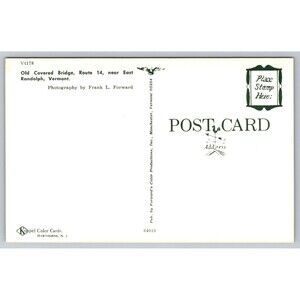 This vintage postcard from Vermont features an old covered bridge in Randolph, capturing the nostalgic charm of the 1960s. The printed lithograph by Koppel Color showcases the picturesque beauty of the United States, specifically the North American continent. With a standard size of 5.5 x 3.5 inches and a divided back design, this single unit postcard is a perfect addition to any collection focusing on covered bridges, cities, and towns in Vermont. Pre-owned, Very nice condition. Unposted. See photos for condition and wear. Great Bundle Item!
