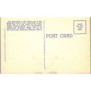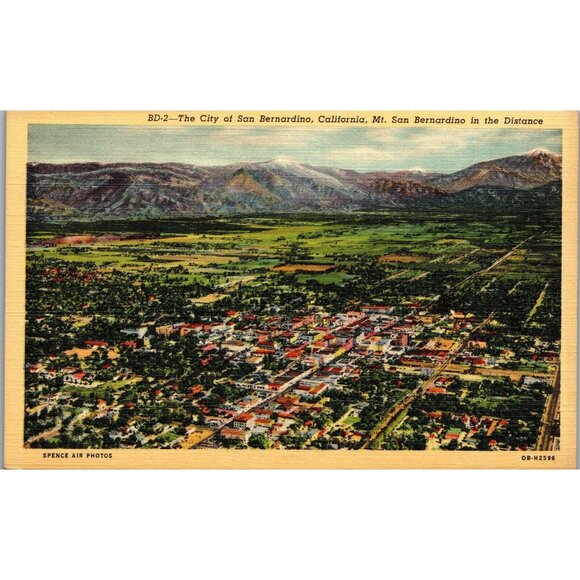 Aerial View of the City of San Bernardino, California, County Seat, Pop over 50,000, Navel Orange Growing District., Mount San Bernardino in background. Bright Colors Unused. 20s era.