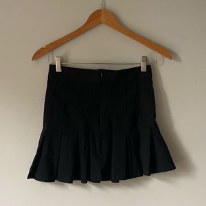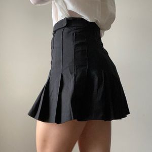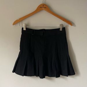 Cute, black mini skirt, perfect for school or casual wear. The skirt is pleated and black w/ a small Velcro belt on one side, just for design, doesn't really help to tighten anything. Zips on the side. I am 5'4'' size S for reference.