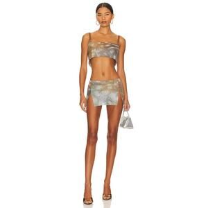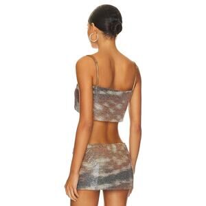 Poster Girl Gracie Crop Top in Matt Bambi. Size S / Small. Features square neck, sleeveless, adjustable shoulder straps, chainmail fabric, lined, and cropped length. Style AW23CM056. Self: 100% Aluminum. Lining: 93% Polyamide, 7% Elastane. NWD / New With Defects. Tape residue on the back.