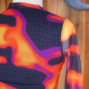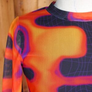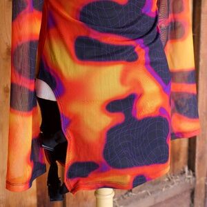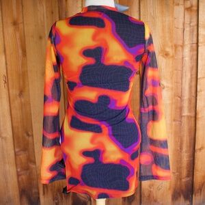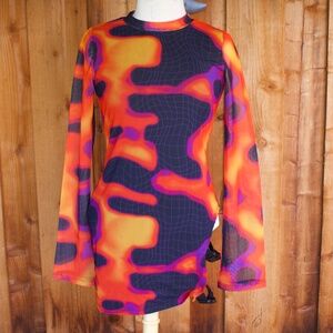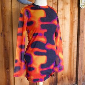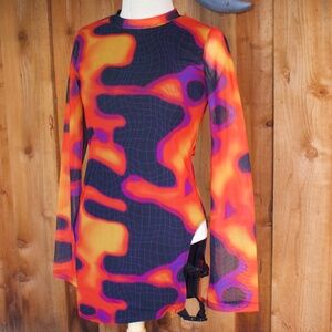 Perfect condition, new without tags. This is a killer dress! Make a statement with these bold colors & heat map print. A cut-out at the thigh, with playful clasp hardware. Long sleeve and mesh, scoop neck and mini. Get ready to be seen in this one!