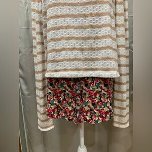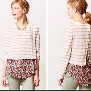 NWOT Anthropologie Ginny Pullover. Floral button up with striped sweater over top. Split back to real more floral patterns of shirt.