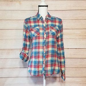 Style: Fairweather Plaid Button Up Top roll tab sleeve
