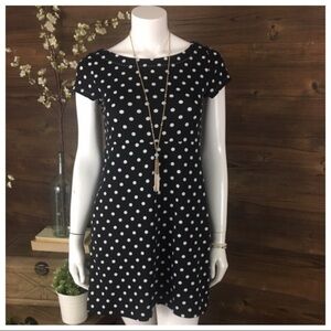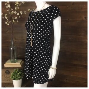 Adorable black and white polka dot tunic with cap sleeves. Can be worn as a dress. Mint green ribbon tie back closure.
