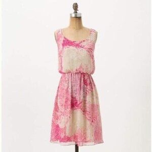 Anthropologie Postmark Rosy Plumes pink tan silk sleeveless dress. Hidden side zipper closure. Flowy skirt and back. Lined. Excellent pre-owned condition with no stains or tears.