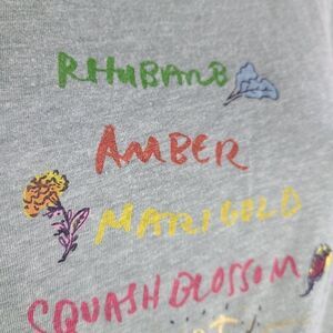 This is a light grey short sleeved top by Postmark, an Anthropologie brand. On the front are printed and embroidered names of plants and flowers.