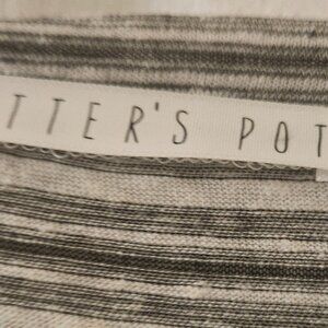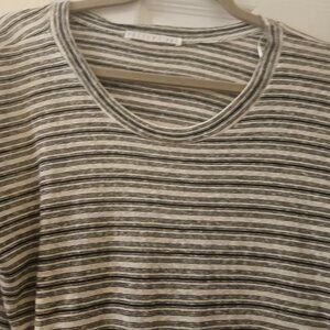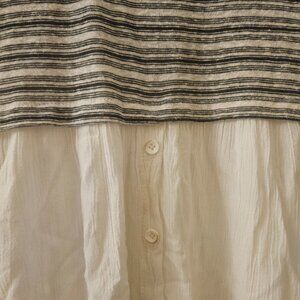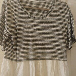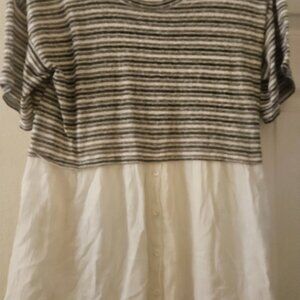 Stylish tunic with black and white stripes. Features a layered design. Comfortable and chic.