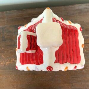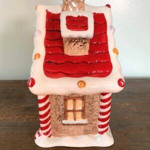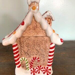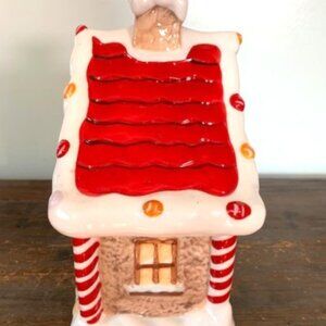 This whimsical gingerbread house cookie jar is a delightful addition to your holiday decor. Classic gingerbread house, complete with intricate details such as candy canes, gumdrops, and icing decorations. The roof is adorned with colorful candies, and the windows and doors are outlined with white icing and adds a touch of charm to any kitchen or display. Great condition, has small chip on bottom-see photos. Measures approx. 5" x 5" square, 5" deep and 11" tall with top on. White spots/lines are glare from lights. *Color may vary slightly from pictures. Please view all photos carefully for complete description.