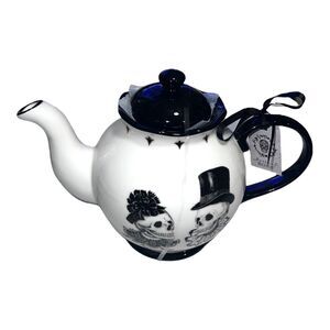 Add a touch of gothic elegance to your kitchen with this uniquely designed teapot. Featuring a Victorian-era skull couple illustration, this white teapot with a black lid and handle is both functional and artistic. The couple is adorned in traditional Victorian attire with a top hat and a floral headpiece. The neck of the teapot is adorned with stars, and the other side features a classic Victorian black and white floral and leaf pattern, making this piece a standout addition to any collection. Perfect for tea lovers and collectors alike, this teapot is sure to be a conversation starter. In addition, it is a wonderful Halloween decorated as well!