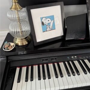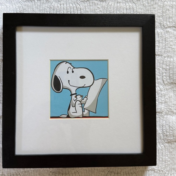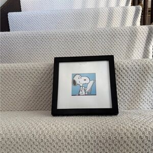 Black frame with white matting - this frame can either hang from wall or be free standing . Measures approximately 9 x 9 inches. Place for picture is 3 and 1/2 by 3 and a 1/2. Snoopy picture that I included can be easily removed and replaced if desired. Fast and very careful shipping.