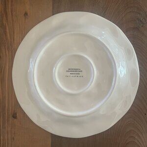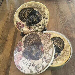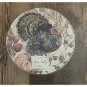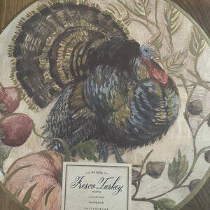 Embrace the warmth of the season with this delightful Pottery Barn Fresco Turkey set of four 9" plates, perfect for festive family gatherings. The intricate design captures the essence of autumn, showcasing a majestic turkey surrounded by a bounty of nature's harvest. These plates are the ideal choice for a memorable holiday table setting and sure to become a family heirloom. New in box. A second set is also available for purchase.