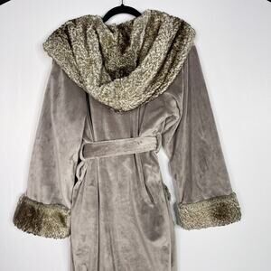 Pottery Barn Gray Caramel Small Faux Fur Robe Plush Tie Waist Hooded Cozy Lounge
