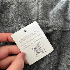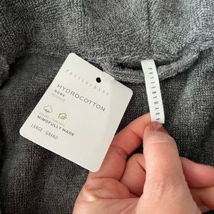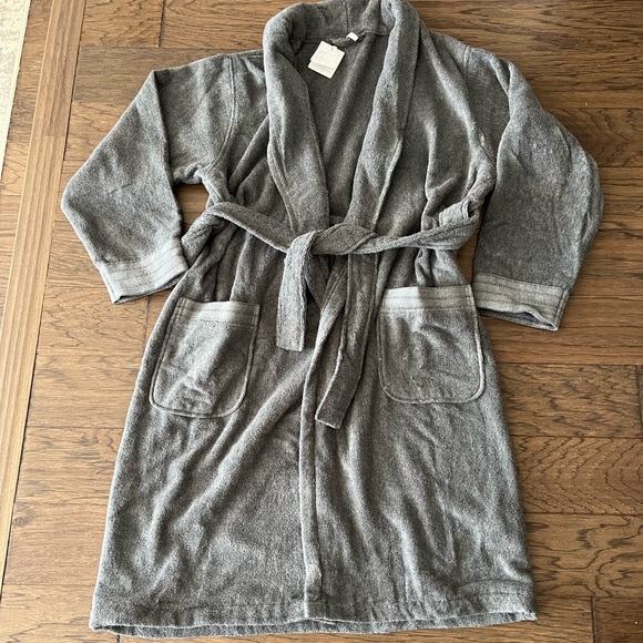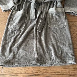 Soft and cozy gray robe. Features a tie belt and two front pockets. Perfect for lounging.
