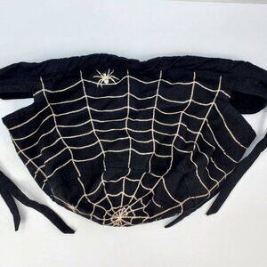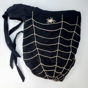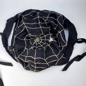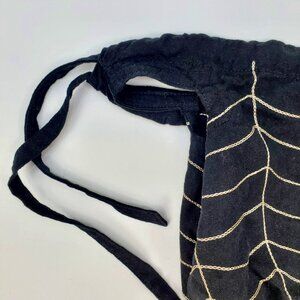 Black with a white spider and web embroidered pattern. Two cut out handles & drawstrings to adjust for sizing. Linen/cotton blend. Machine wash.