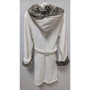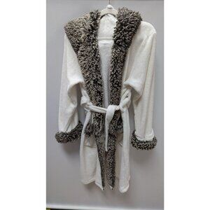 Pottery Barn Ivory/Brown Faux-Fur Robe. Size Small. Gently used, with minor spotting and some wear to the faux-fur; in overall good condition. It has a fuzzy/furry texture with faux-fur cuffs and collar. It has 2 pockets and includes the waist tie.