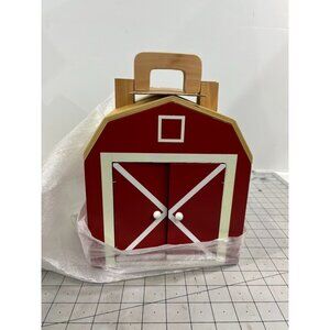 A charming wooden farm playset designed for kids, featuring a vibrant red barn with doors that open and close, complete with accessories.