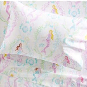 Pottery Barn Kids Bailey Mermaid Organic Toddler Bed Sheet Set. Featuring colorful mermaids and playful aquatic details, this sheet set is made from super-soft organic cotton. PBK exclusive design. Sheet set fits a standard crib mattress. I purchased this adorable sheet set for my daughter but never used it. Purchased in Dec 2023 and it's unopened and in the original PBK packaging. Mermaid sheet set no longer sold by PBK.