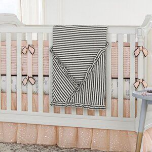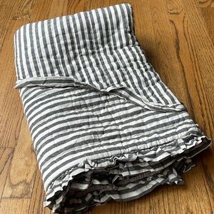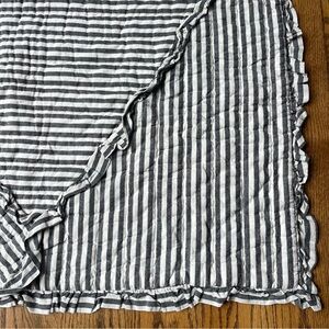 Pottery Barn Emily & Meritt Ruffle Candy Stripe Crib Quilt Comforter in Charcoal and White. Toddler quilt that is hand quilted with decorative stitching and machine washable. Excellent Condition. Item is from a pet and smoke free home.