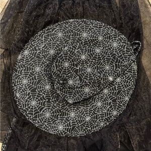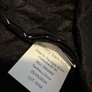 Pottery Barn Kids witch glow in the dark costume with white spider web pattern. Includes glow in the dark witch hat
