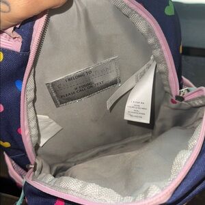 Really great condition, mini backpack with “Riley” embroidered on the front in pink. Navy blue backpack with multi colored hearts.