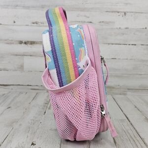 This cloth childrens' lunch box is sky blue with happy unicorns all over. It measures 9 x 8 x 4 inches. Hard inner liner with removable compartments.