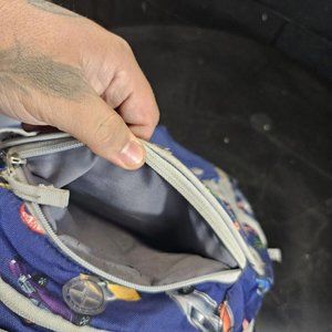 Used and has a few blemishes. No lunch box. Some loose stitches in front where some one may have put a patch