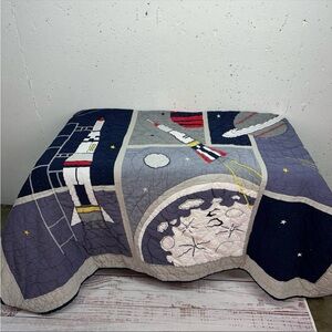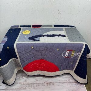 Pottery Barn kids Outer Space Astronaut Rocket Twin Size Quilt. In good/ fair condition: not perfect condition one small hole, a light stain or two and some fading. Still has plenty of life great project piece Twin 66 x 83”