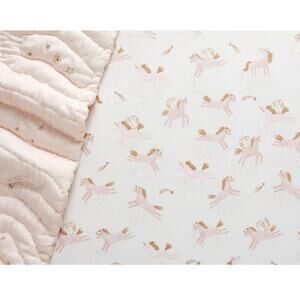 Add a touch of charm and enchantment to their sleep space with our so-soft bedding featuring magical unicorns. Expertly made with our signature quality and plush, pure organic cotton, our fitted sheet set provides their bed with lasting comfort and style.