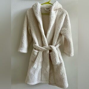 Experience ultimate comfort with this cream pajama robe from Pottery Barn Kids, featuring a plush fabric and a cozy hood. Has 2 pockets and waist tie.