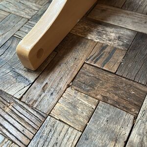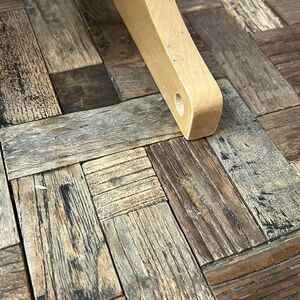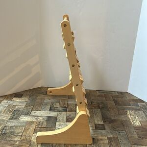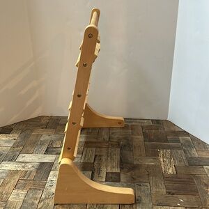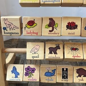 Wooden Alphabet Abacus. So cute! Wooden pieces swivel on dowels. Letters with corresponding words/pictures on flip side. Good conditon with scratches and marks from normal wear. Zebra has pencil marks on it(I didn’t try to remove). The dowel across on the back is missing. It doesn’t affect the steadiness or balance of the abacus(see last 2 photos). Not sure the brand. It looks like the pottery barn kids abacus, but there is no marking/brand on it.