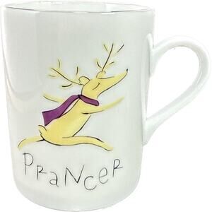 This is a great Pottery Barn PRANCER Reindeer Porcelain Mug. It features Santa's reindeer Prancer wearing a red scarf and has a platinum rim.