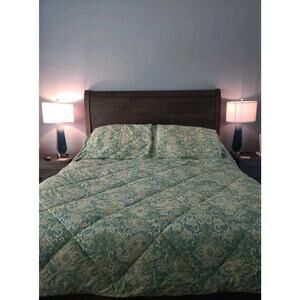 The Pottery Barn Paisley Emma Full Queen Quilted Comforter set includes a stylish comforter with a paisley pattern in blue, as well as two standard shams. Made of soft cotton and featuring a quilted design, this bedding is perfect for creating a cozy and inviting bedroom atmosphere. The Pottery Barn brand ensures quality and durability, making this comforter set a stylish and comfortable addition to any bedroom.