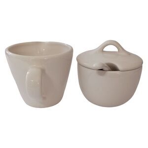 Pottery Barn Sausalito Creamer & Sugar Bowl Set With Spoon Off White Stoneware. Condition is pre-owned with no chips or cracks. Creamer has one mark inside. Comes with spoon. Off white color. Measures about 4" x 4". Please see all photos for detailed condition.