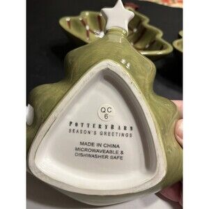 This is a set of 4 ceramic candy nut bowl dishes from Pottery Barn, featuring a Seasons Greetings Christmas tree design. The bowls are multicolored and are multipurposecandy or nut dishes. They are perfect for adding a festive touch to your holiday gatherings and decor.