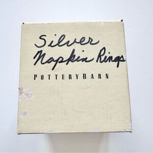 The product is a set of 12 silver plated napkin rings in a curved square design from Pottery Barn. These napkin rings are multipurpose and add a touch of elegance to any table setting.