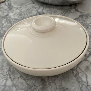 Very MCM Pottery Barn Dish. Dishwasher and microwave safe, in very good condition, no crazing or cracks. It does have a small chip on the bottom, please see picture, as well as a permanent marker writing on the bottom. Please see all photos.