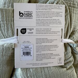 This is a brand new with tags set. Please note that the duvet cover appears to have been removed from it's packaging and then folded up again, but is in new condition - the fabric still has it's unwashed sizing. The Soft Gauze Duvet Cover and Shams are a best selling item on Pottery Barn Teen. They are airy and light weight. The duvet cover has interior ties to hold a duvet in place and the added textural feature of a tie closure. The shams also have tie closures. These are in "Sage", a soft green - the shams are no longer available in Sage online, so it's a perfect opportunity to get the set. The duvet cover is Full/Queen and the same are both standard size.