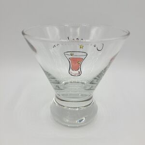 Pottery Barn Stemless Martini Glass with Cosmopolitan design. The glass is in very good preowned condition with no chips or cracks. The glass circumference is 4 inches across the top and 4 inches high. Two other glasses of the same style with different designs are also available for bundle purchasing.