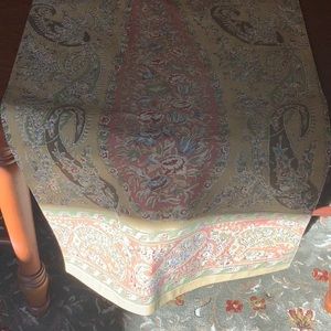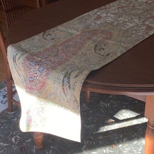 Pottery Barn paisley and floral table runner, perfect for long dining table OR shorter and draped on ends (in picture) Colors are peach, greens and mustard, with creams and tans