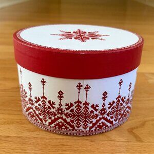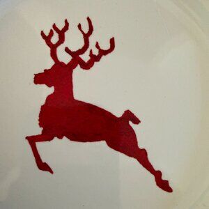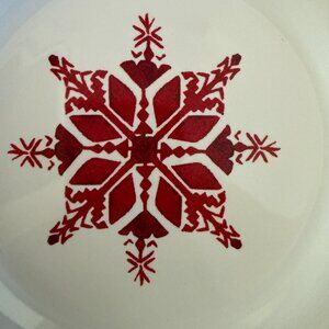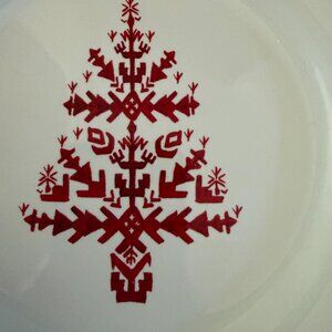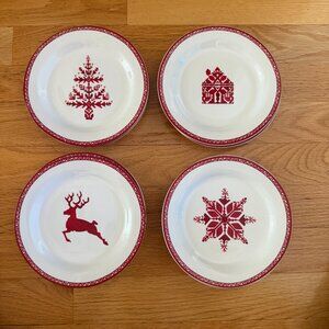 Pottery Barn Tahoe Fair Isle Stoneware Appetizer Plates Set of 8. Four different designs in the center. Two Christmas tree plates, two house plates, two snowflake plates, and two reindeer plates. Red and white with a red and white decorative edge. Diameter of the plates are approximately 6.5". Excellent pre-owned condition. Plates are like new with no known flaws. No chips or cracks. Decorative storage box and cardboard plate liners included. Box has some signs of wear. Set of 8.