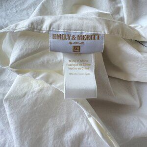 This is a gently used, pre-owned duvet cover. It has 2 small spots, which are pictured. The sweetly scalloped trim gives the style of the Pottery Barn Teen Emily & Meritt The Scallop duvet cover a pretty finishing touch. It is an ivory color with black trimmed edging.This duvet cover is designed exclusively for Pottery Barn teen by celebrity stylists and fashion designers Emily Current and Meritt Elliott. This is a twin size duvet cover with button closure, made of 100% cotton percale. It also Includes a bonus standard size sham. Sham has a envelope style closure.