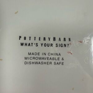 Pottery Barn What’s Your Sign Yellow Aquarius 8 Inch Plate. Part of a collection featuring all zodiac signs. Crafted from bone china and was manufactured in 2002. Microwave safe and dishwasher safe. 8 inches wide and 1 inch high. Discontinued piece. Excellent condition.